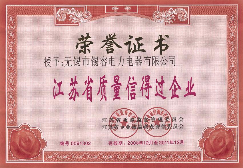 2008年江蘇省質(zhì)量監(jiān)督管理委員會(huì)、江蘇省企業(yè)誠(chéng)信調(diào)查評(píng)估委員會(huì),授予無(wú)錫市錫容電力電器有限公司 “江蘇省信得過(guò)企業(yè)”榮譽(yù)證書(shū)